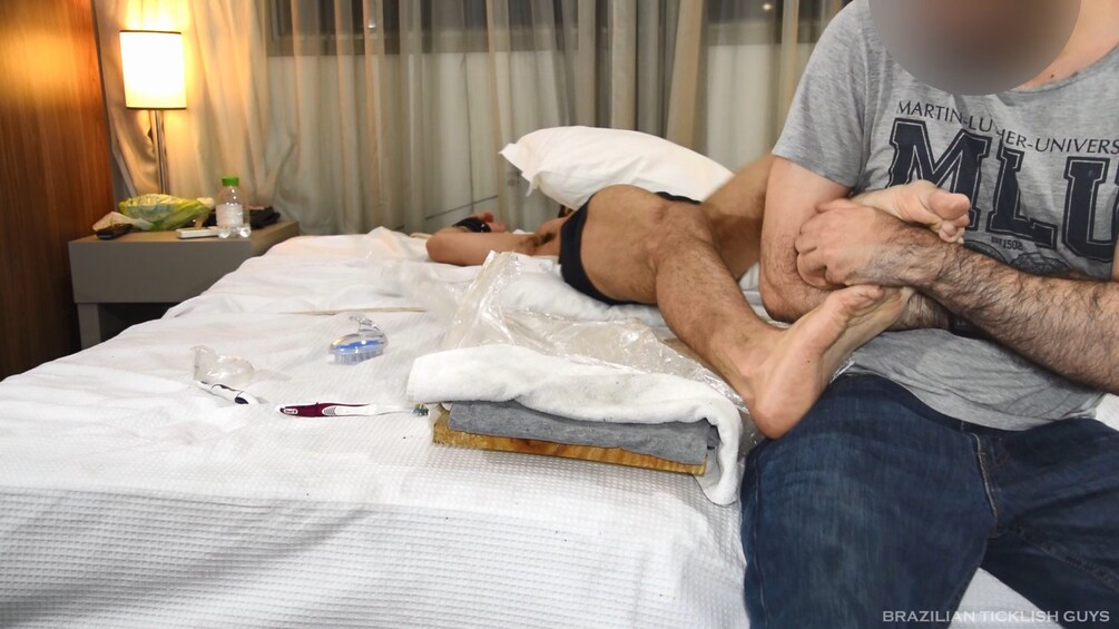 Though Danilo hates tickling he agreed to come back for another video only because he needed some money. And since last time he struggled a lot, I've decided to mummify his legs together with a wooden board so that he wouldn't kick me in the face while I tickled his feet.